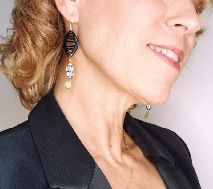 Boucles d'oreilles femme de soirée vintages et chic, en bakélite cristaux et pierres de verre vertes de fabrication française. Originale et élégantes à porter lors de vos soirées ou sorties elles sont légères et leur monture est en métal argenté sans chrome sans nickel. Boucles d'oreilles réalisées à la main avec des cristaux, pierres et bakélite vintages. Bijoux français.
