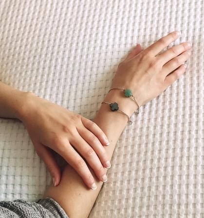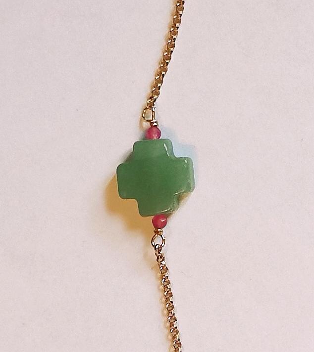 Bracelet femme fines mailles plaquée or orné d’une croix en hématite anthracite ou aventurine verte selon votre choix. Ce bracelet croix est entièrement réalisé main avec des matériaux recyclés en France. Deux petites pierres en quartz rose ou vert cernent la croix la base du bracelet est en laiton plaqué or sans chrome sans nickel. Un bracelet femme tendance et intemporel, fin et original.