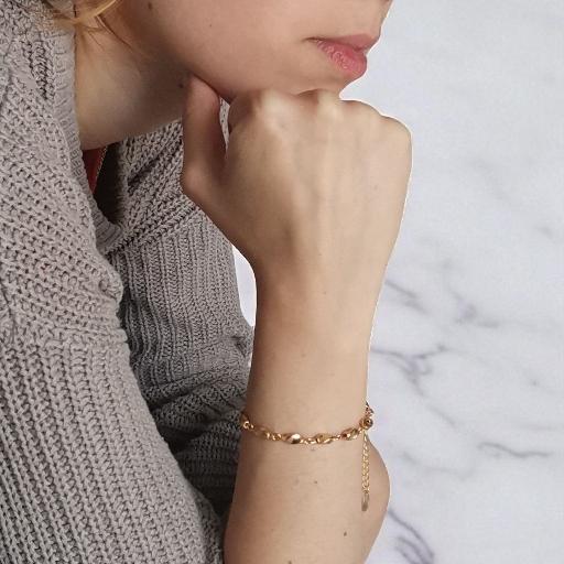Bracelet femme en maille fantaisie légèrement torsadée, plaqué or sur une base laiton sans chrome sans nickel et réalisé main en France. Une maille intemporelle et discrète pour ce bracelet femme qui pourra se porter tous les jours. Longueur avec chaînette de rallonge : 20 cm.
