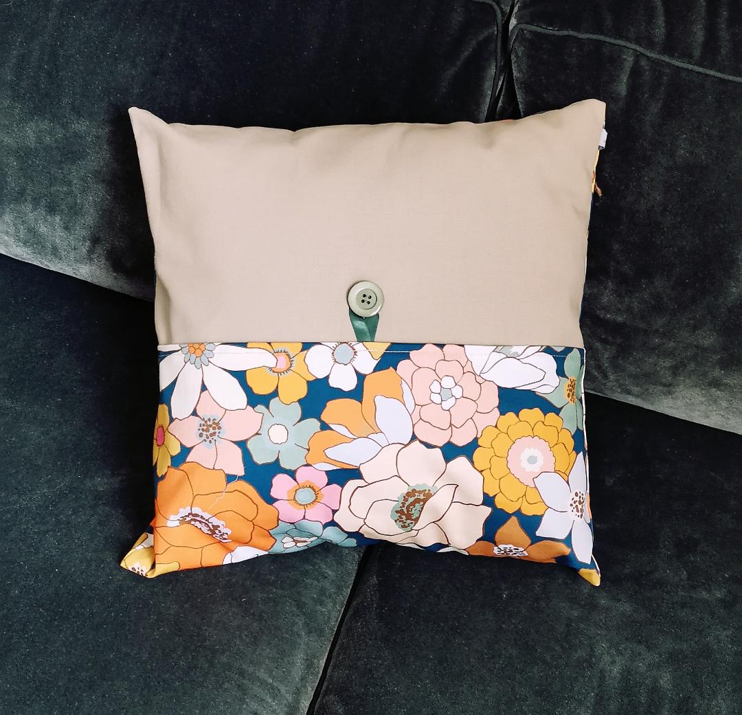 Très frais ce coussin esprit années 70 en coton et polyester réalisé main en France avec motifs fleurs ; Coussin de forme carrée 40 x 40 cm, dos est en partie uni fermé par un gros bouton. 1 pièce de disponible.