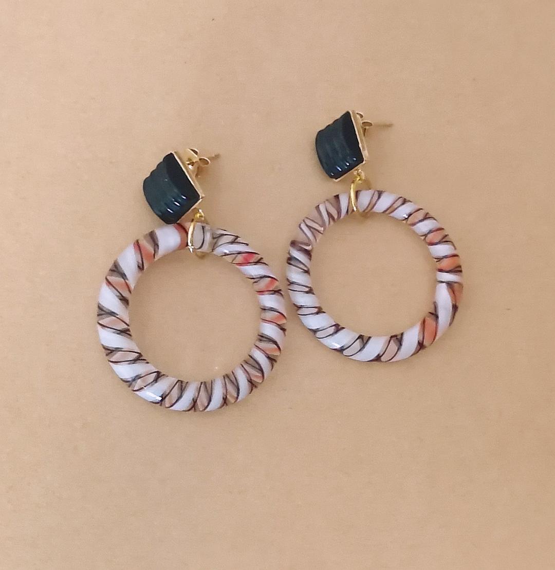 Originales les créoles femme en verre torsadé, esprit vénitien tricolore : blanc, noir et ocre rouge. Elles sont réalisées main en France et montées sur une attache en laiton doré à l’or fin avec deux cabochons cabochon striés noir en bakélite. Fermeture avec 2 poussoirs. Sans chrome sans nickel.